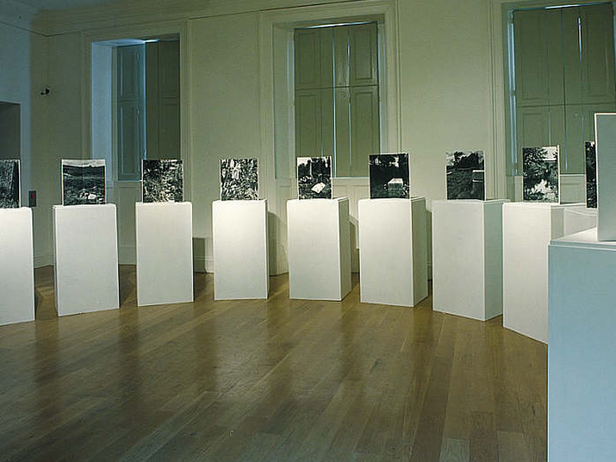 Visitors to the exhibition can take a glimpse into the lush grounds of Little Sparta for themselves through Finlay’s installation Nature over again after Poussin (1979). Filling a whole room, the work comprises 11 photographs set on plinths, each offering different viewpoints of Little Sparta. A carved stone can be found within each image, ‘signed’ with the initials of artists who embraced a more classical approach to painting landscapes. The work encourages a moment of escapism, embracing time to get lost within the serenity of each photo.